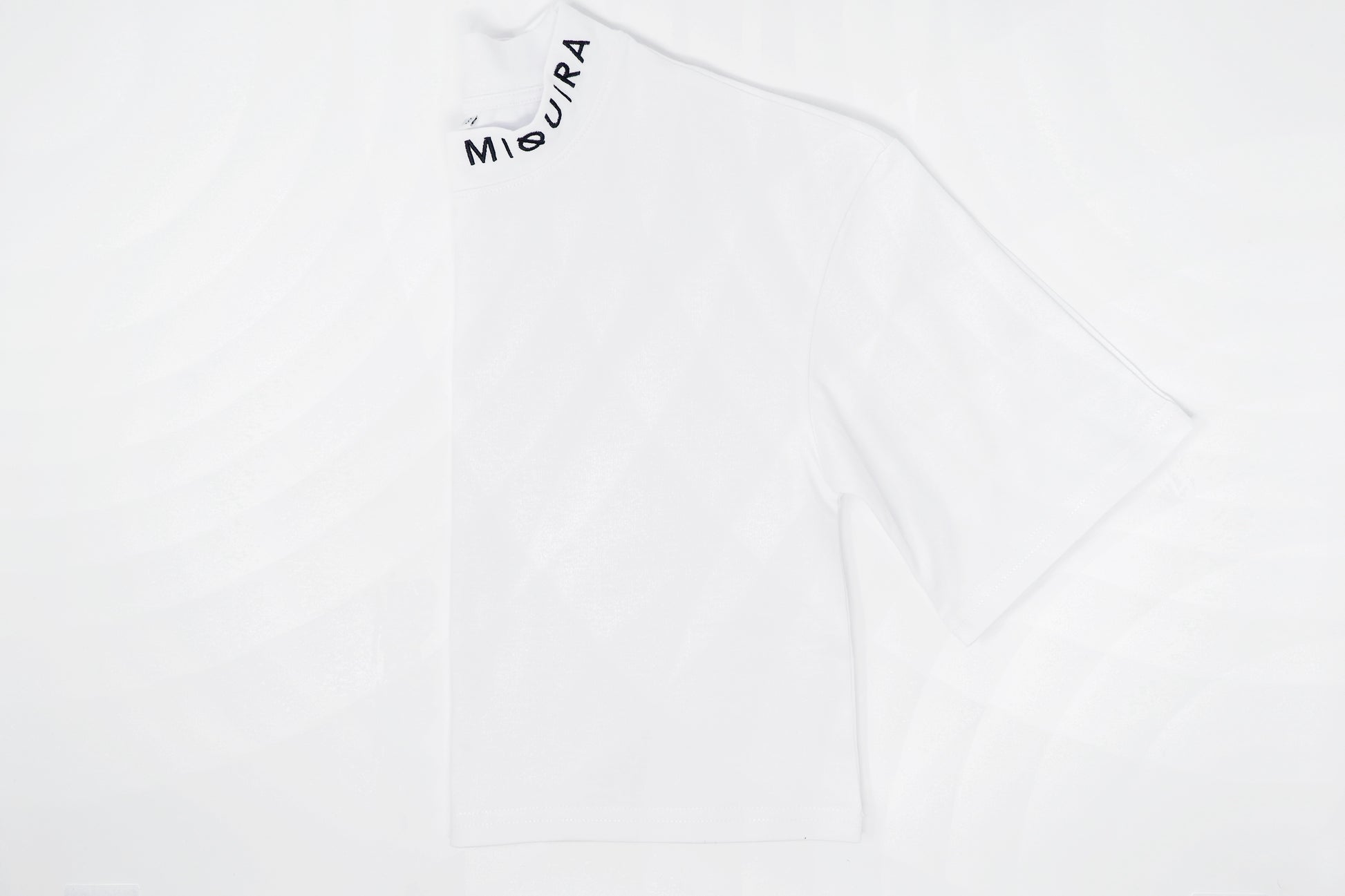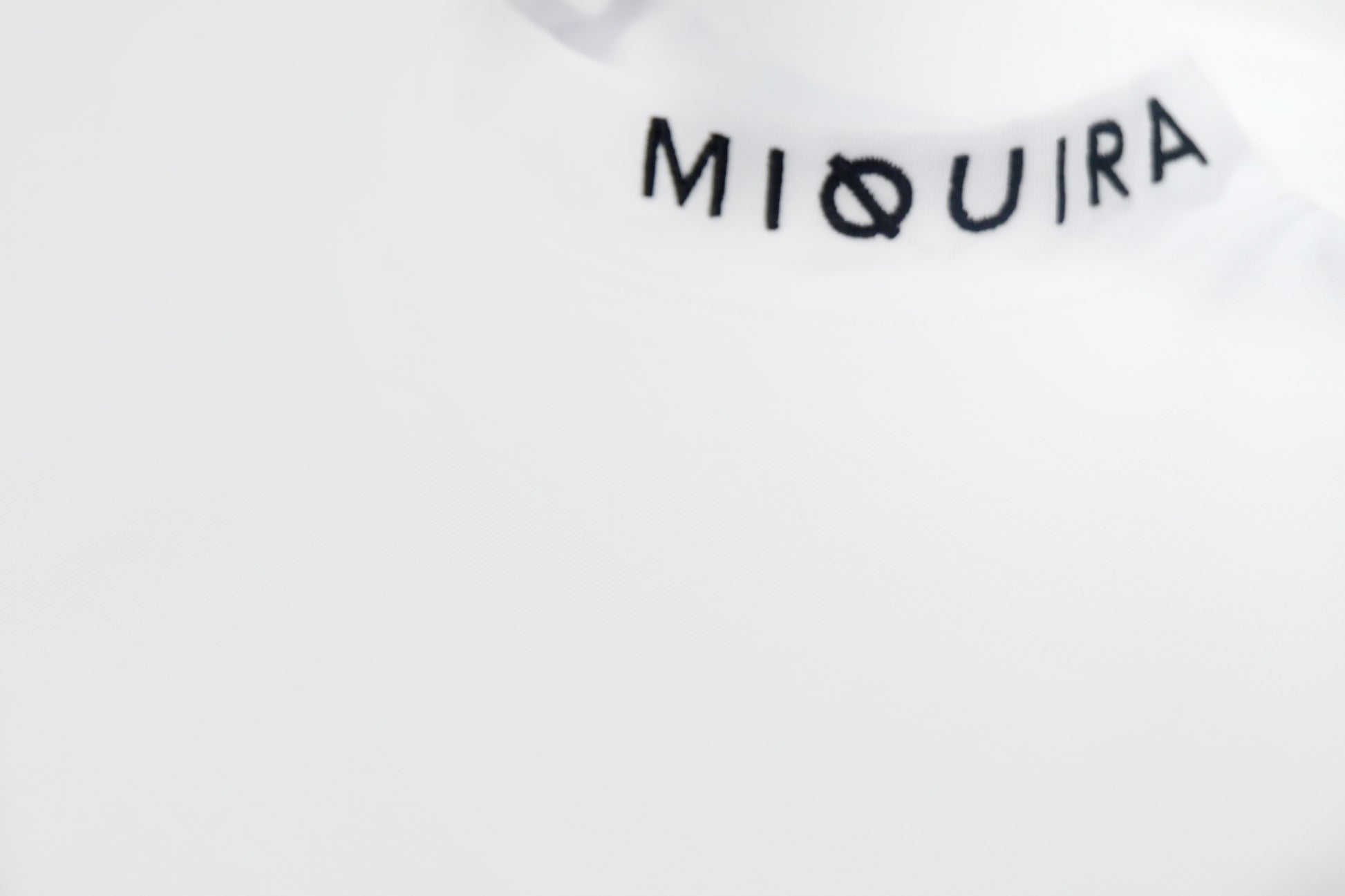 Mock neck crop top with flare sleeves and a flare fit. Embroidered "Miquira" logo on the neck.